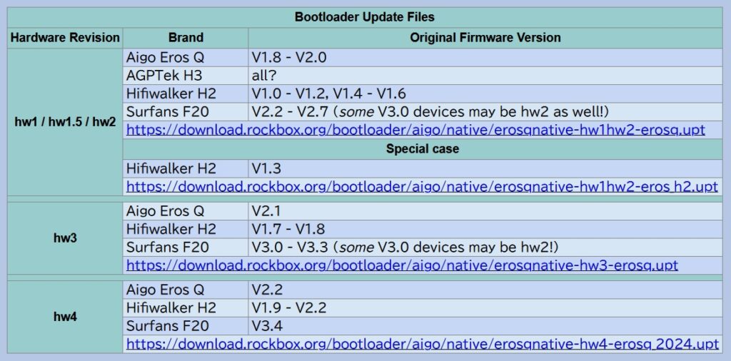 ROCKbox公式サイト https://www.rockbox.org/daily.shtml のAIGO EROS Q / K (Native) >> rockbox-erosqnative-******.zip をダウンロードし、SDカードのルートに解凍します。